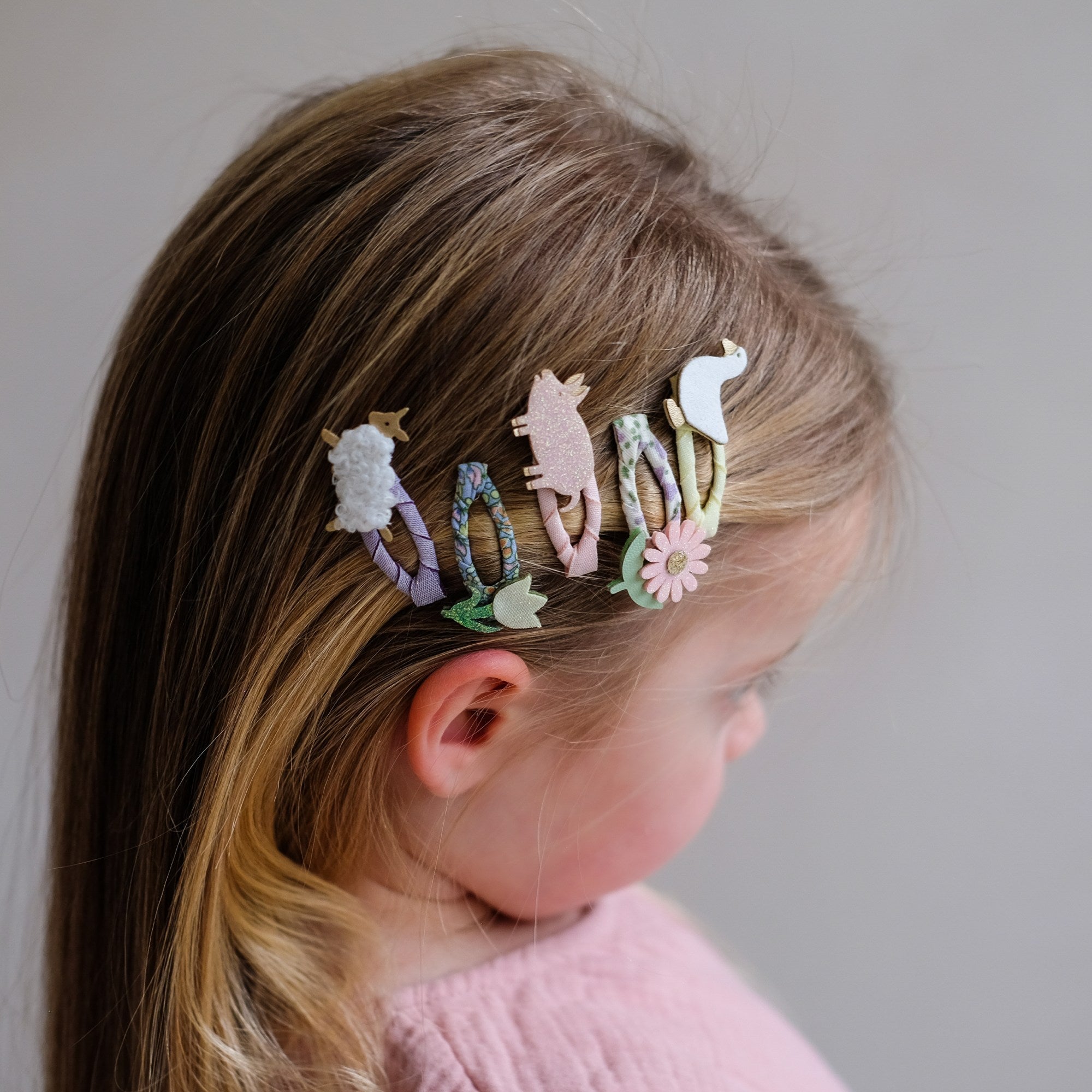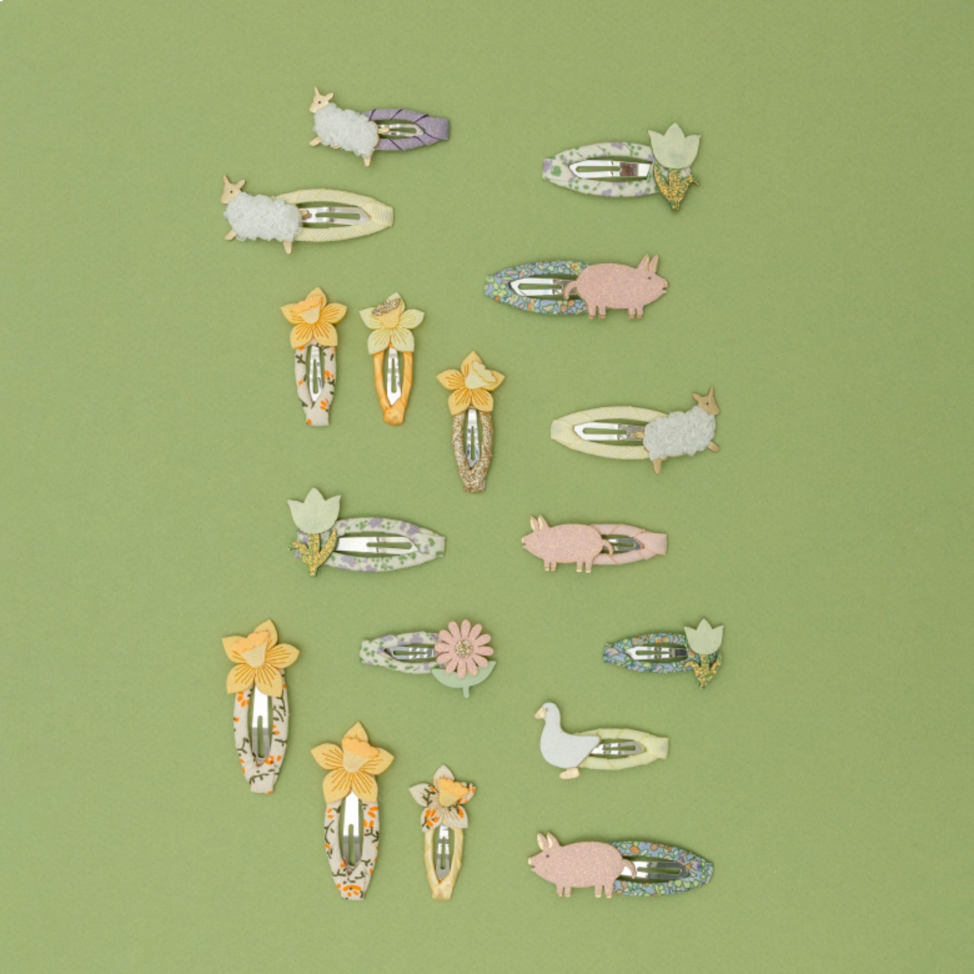 These Farmyard mini clips are full of countryside charm! Featuring the sweetest little farmyard animals and some fresh blooms too - the ideal accessories for getting out 'n' about this Spring!