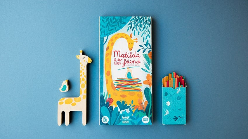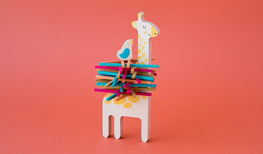 The sticks are distributed among the players and we then play in turns. The youngest starts and carefully places the first stick while making sure no sticks fall off the giraffe. The rest of the players do the same in turn. If a player drops some sticks, he picks them up and adds them to his pile. Once the challenge is over, the player who has run out of sticks will need a very steady hand to gently place the little bird on top without the nest collapsing!