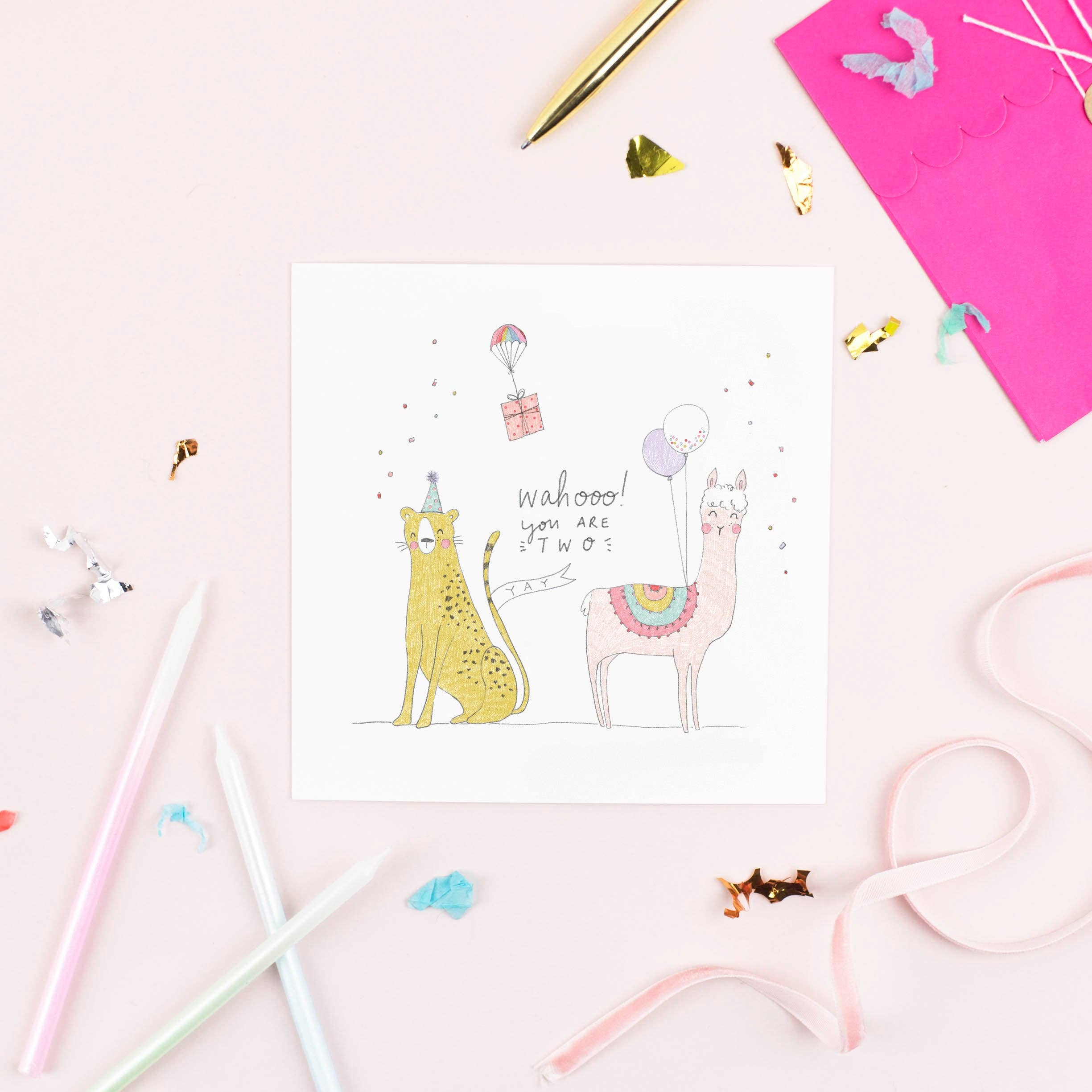Two years old! Already! Can you believe it? This little gang are ready to celebrate, pressies and confetti at the ready! Original digital illustration. Blank for your own message. Digital print on 250gsm textured card. Kraft envelope provided (All cards are designed to be framed after gifting).