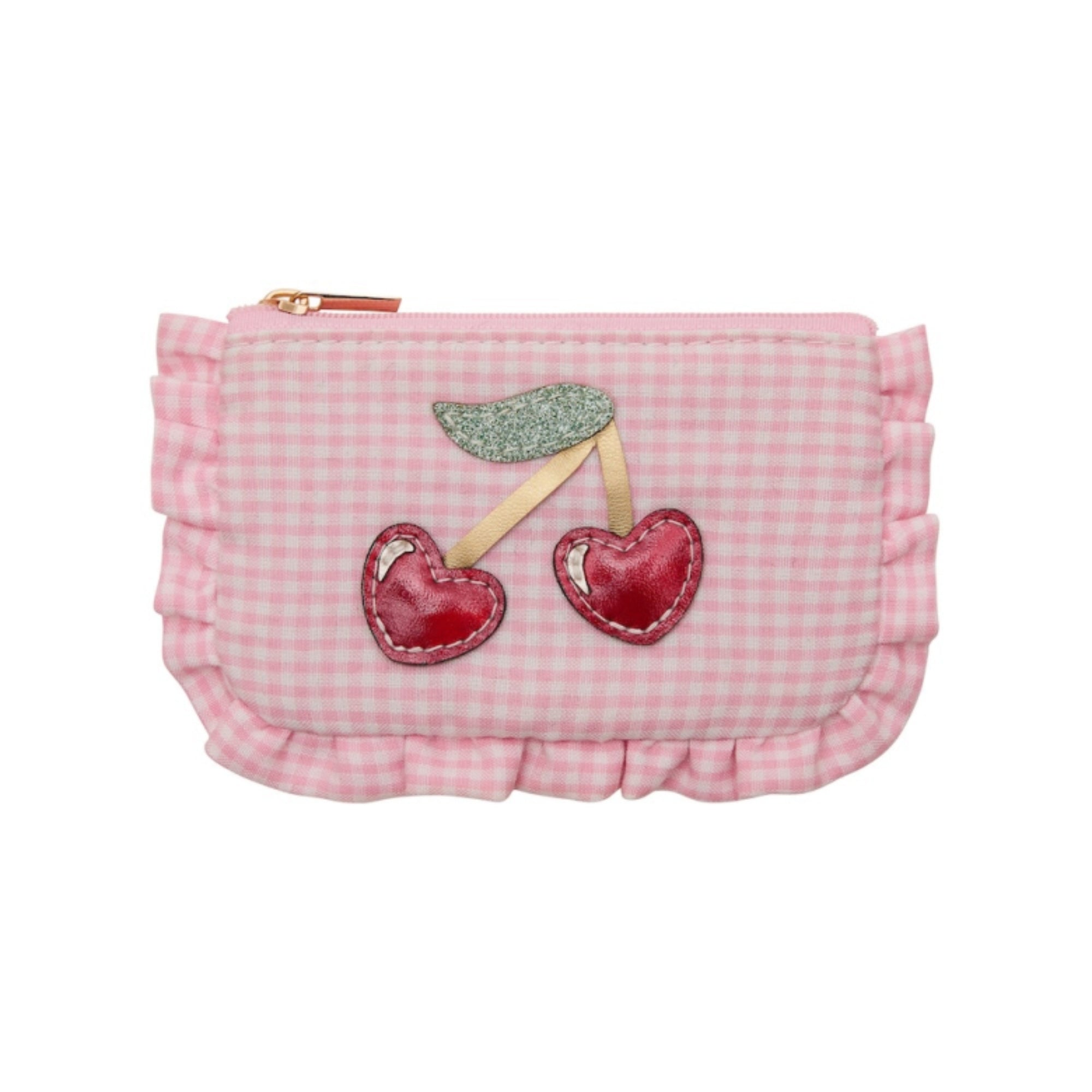 Mimi and Lula's charming new Cherry purse is crafted from pretty pink gingham, and embellished with a bright red pair of metallic fabric cherries with gold metallic stalks and a green glitter leaf. Featuring a ruffled edge plus a zip top to keep all their little goodies or pennies safe! A perfect gift idea!