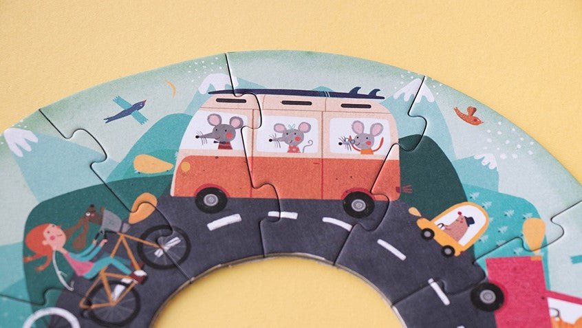 Cautious drivers, happy cyclists and trucks loaded with ice cream. May the route never end! Once the puzzle is assembled, it becomes an observation game. Who will be the first to find the 10 drivers?