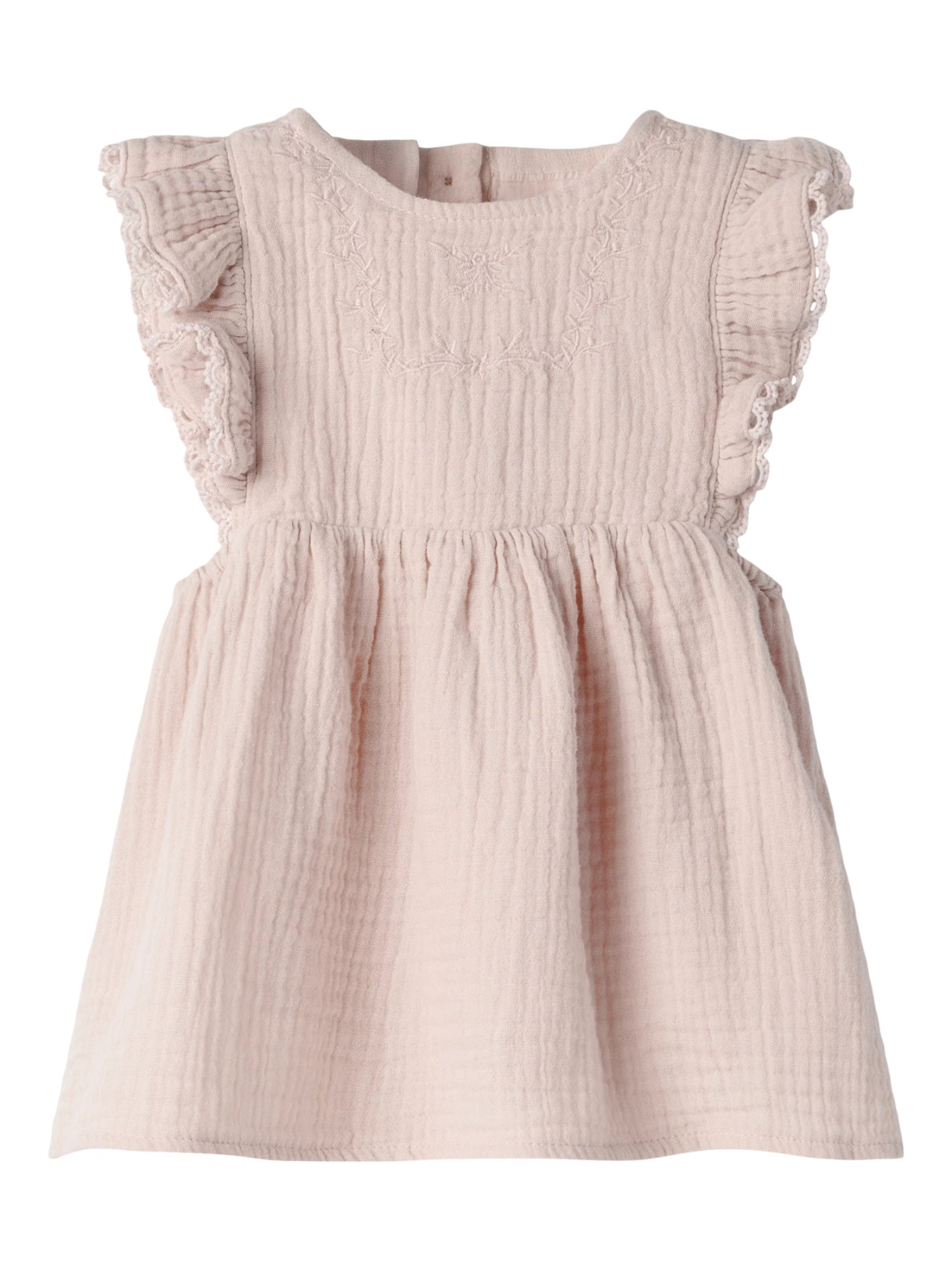 A beautifully delicate piece, this Embroidered Dress is crafted from soft, lightweight organic cotton muslin, giving it a gentle texture and an airy, comfortable feel against delicate skin.