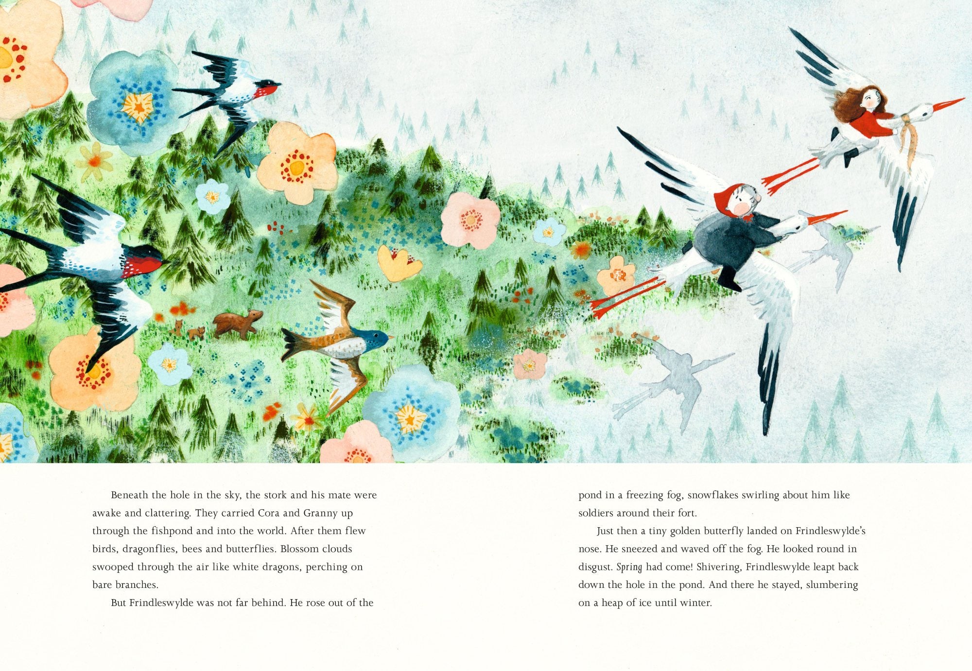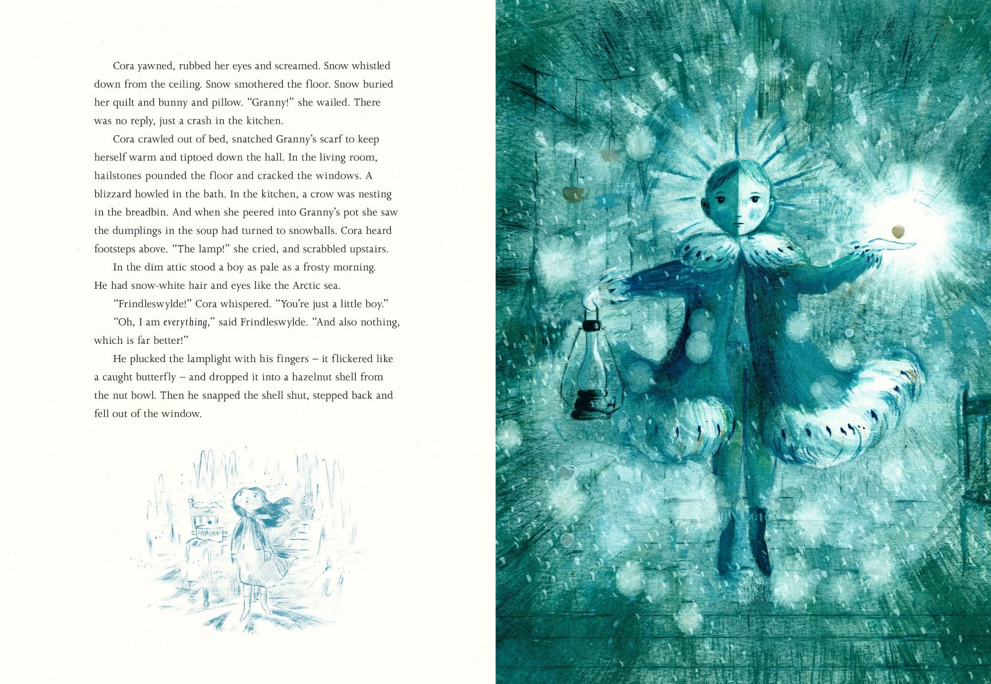 When the mysterious boy Frindleswylde enters Cora and Grandma's house in the woods, he steals the light from their lantern. Without it, Grandma will not be able to return home after work in the dark. Cora is determined to get the lantern back, but first she must follow Frindleswylde down a hole in the pond that leads to his magical frozen kingdom. There, he sets her three Impossible Tasks.