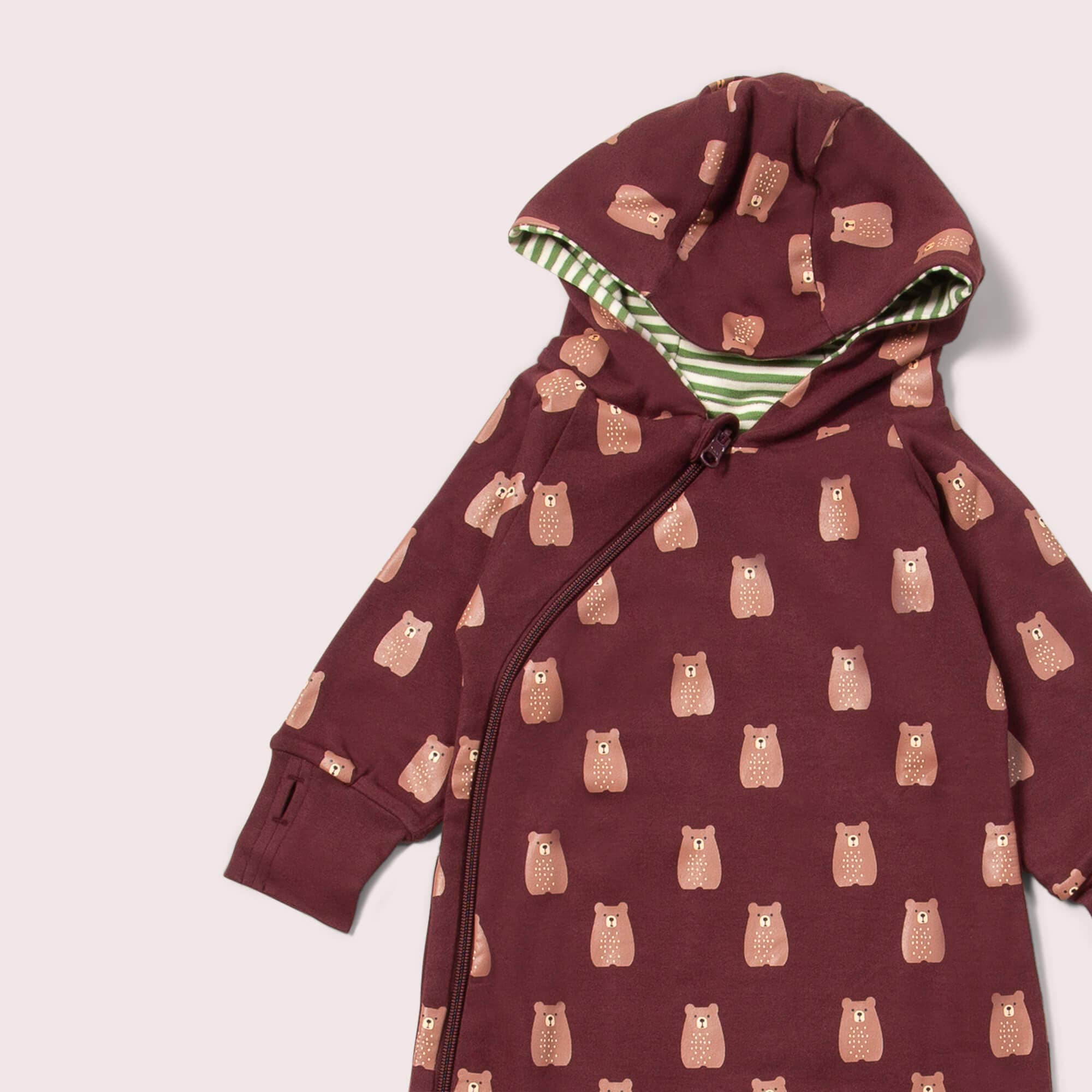 The name says it all! The Brown Bears Snug Suit is a reversible double-layer outerwear style that's great for babywearing or for wearing over clothes to stay extra warm inside, or out. With two layers of thick interlock cotton, featuring a cute brown bears all-over print on one side and classic stripes on the reverse, a cosy hood and thumbholes to keep them snug as a bug on chilly days.