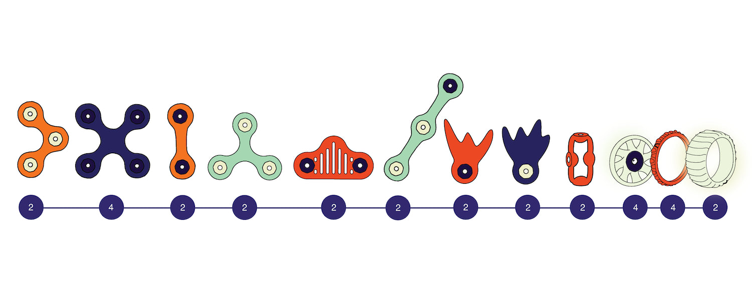 Features: 30 pcs in 12 unique shapes, including wheels.