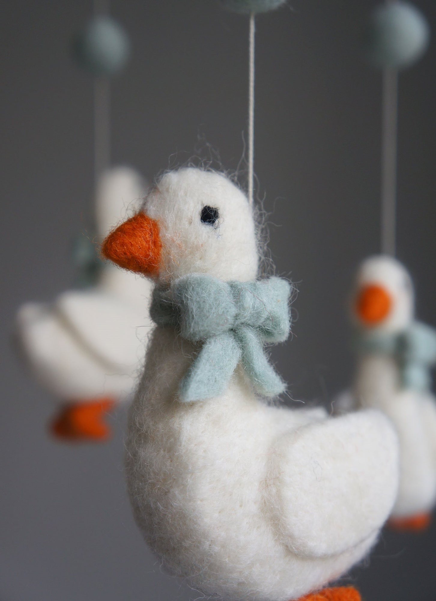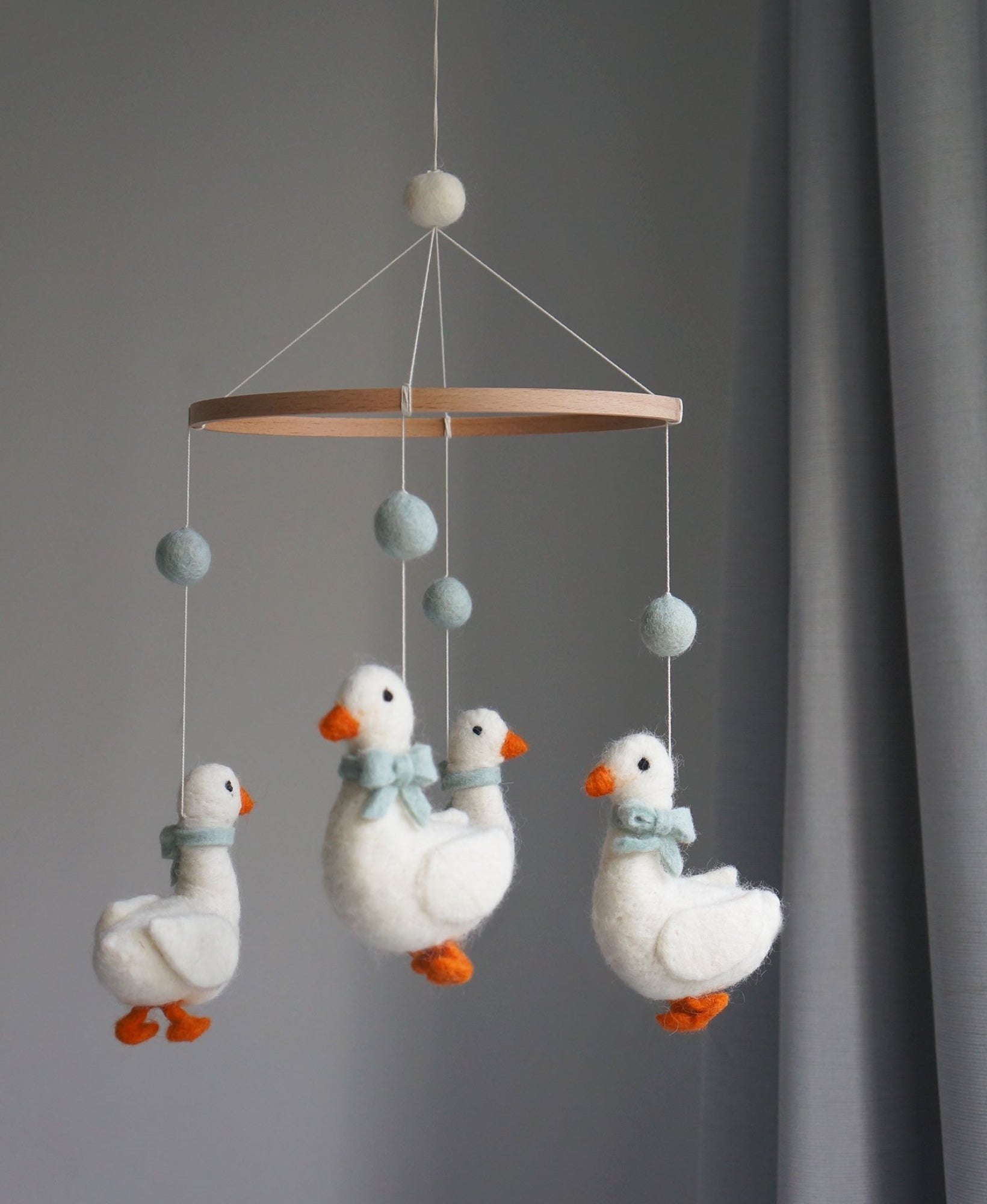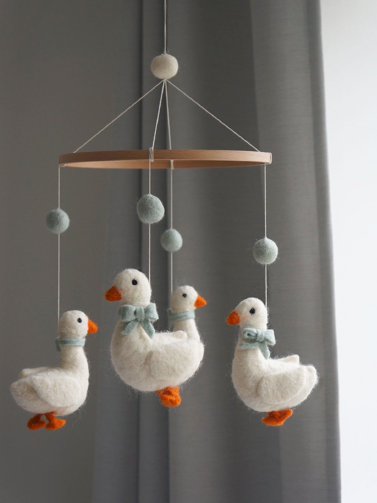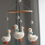 Introduce a touch of countryside charm to your nursery with this enchanting handmade wool mobile! Adorable geese wearing sweet little bows and pompoms twirl gently above the cot, bringing playful wonder to baby's room. Each piece is crafted with meticulous care by talented artisans.