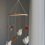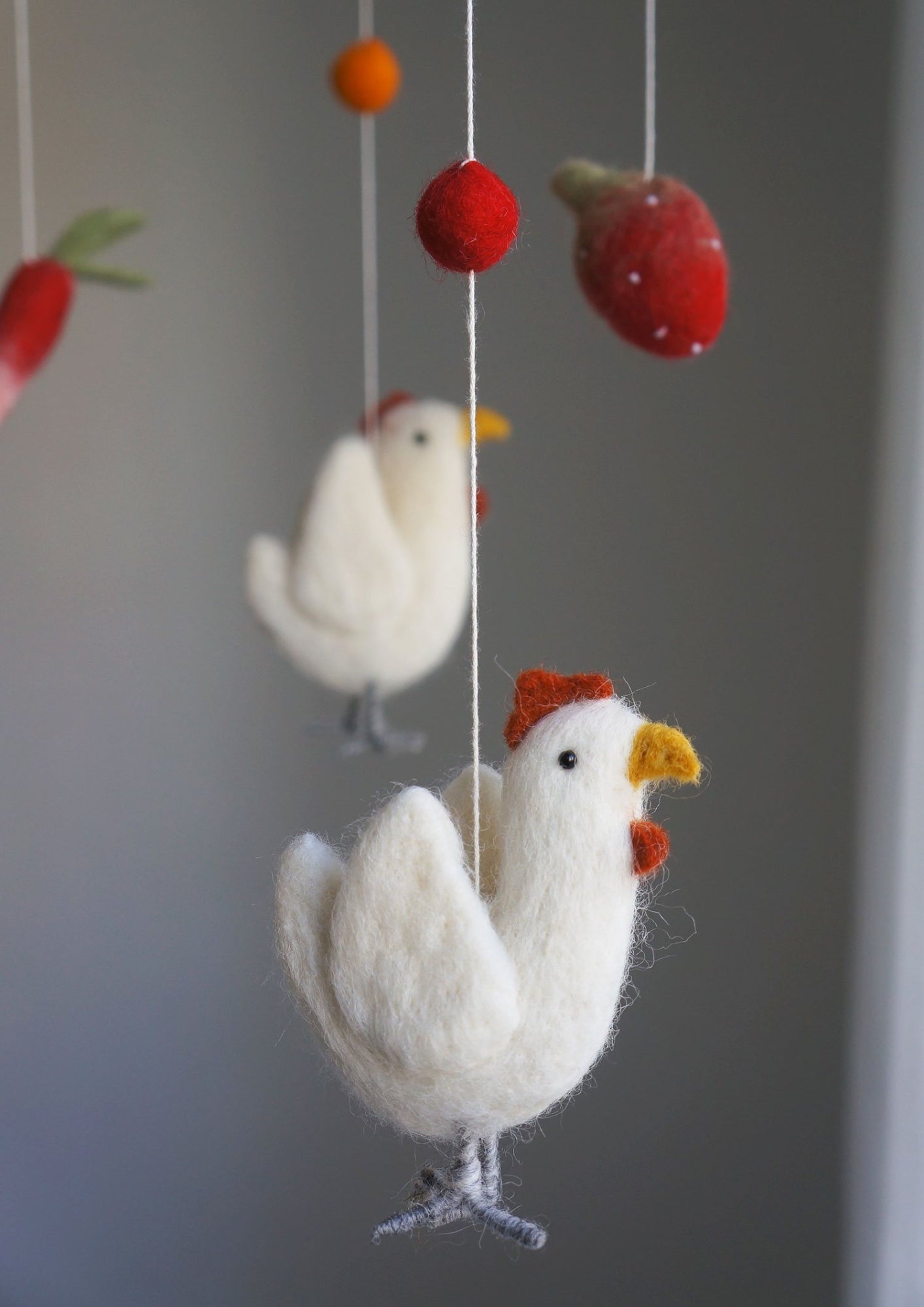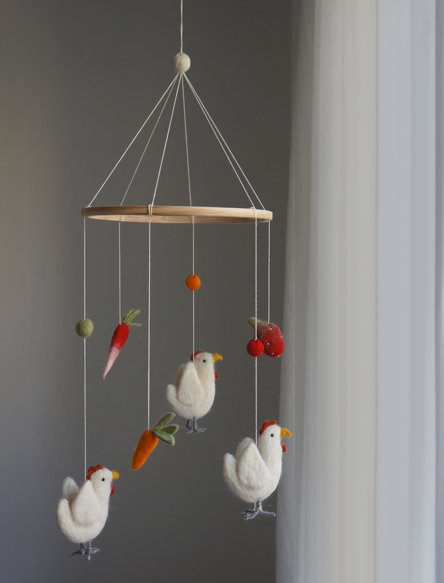 Introduce a touch of countryside charm to your nursery with this enchanting handmade wool mobile! Adorable hens and veggies twirl gently above the cot, bringing playful wonder to baby's room. The mobile is created with care and attention to detail by skilled crafts men and women.