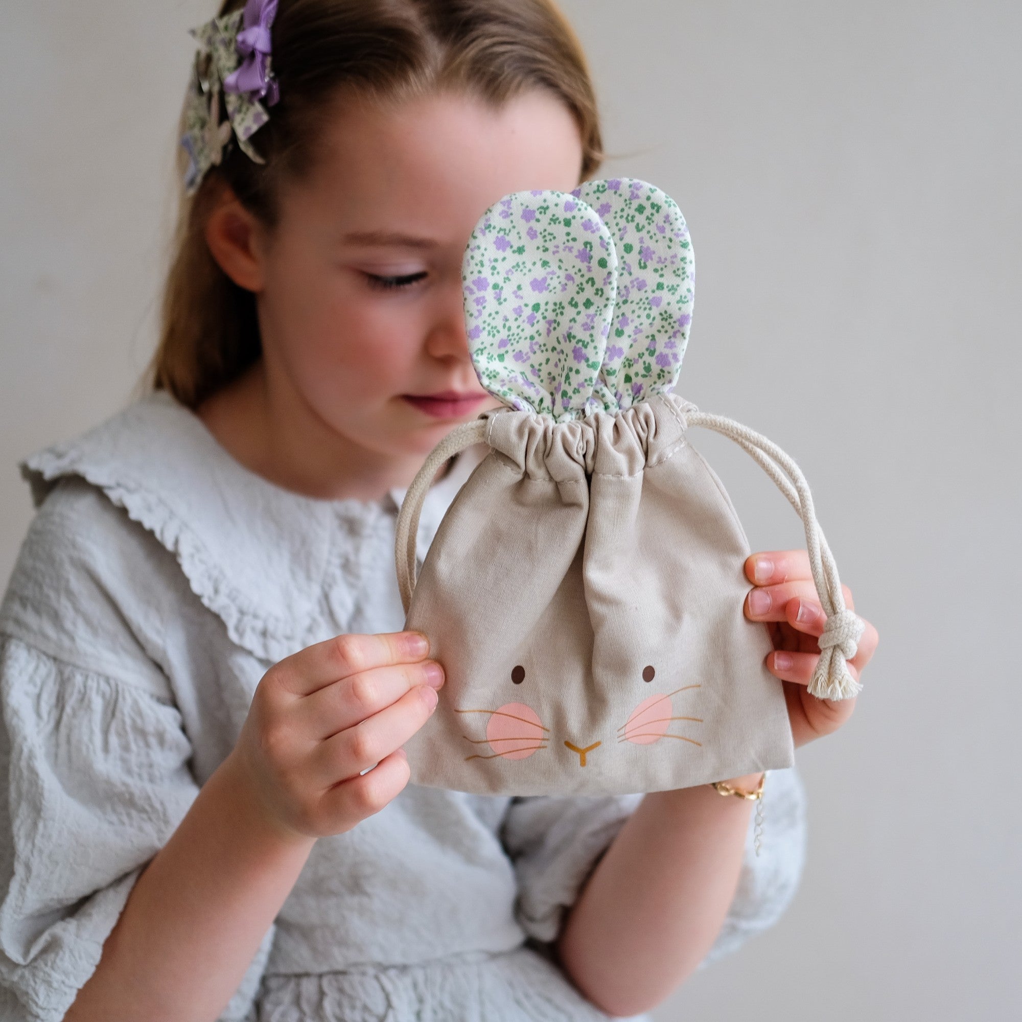 Fabric pouch with sweet printed bunny face, floral fabric 'ears' and finished with a drawstring rope