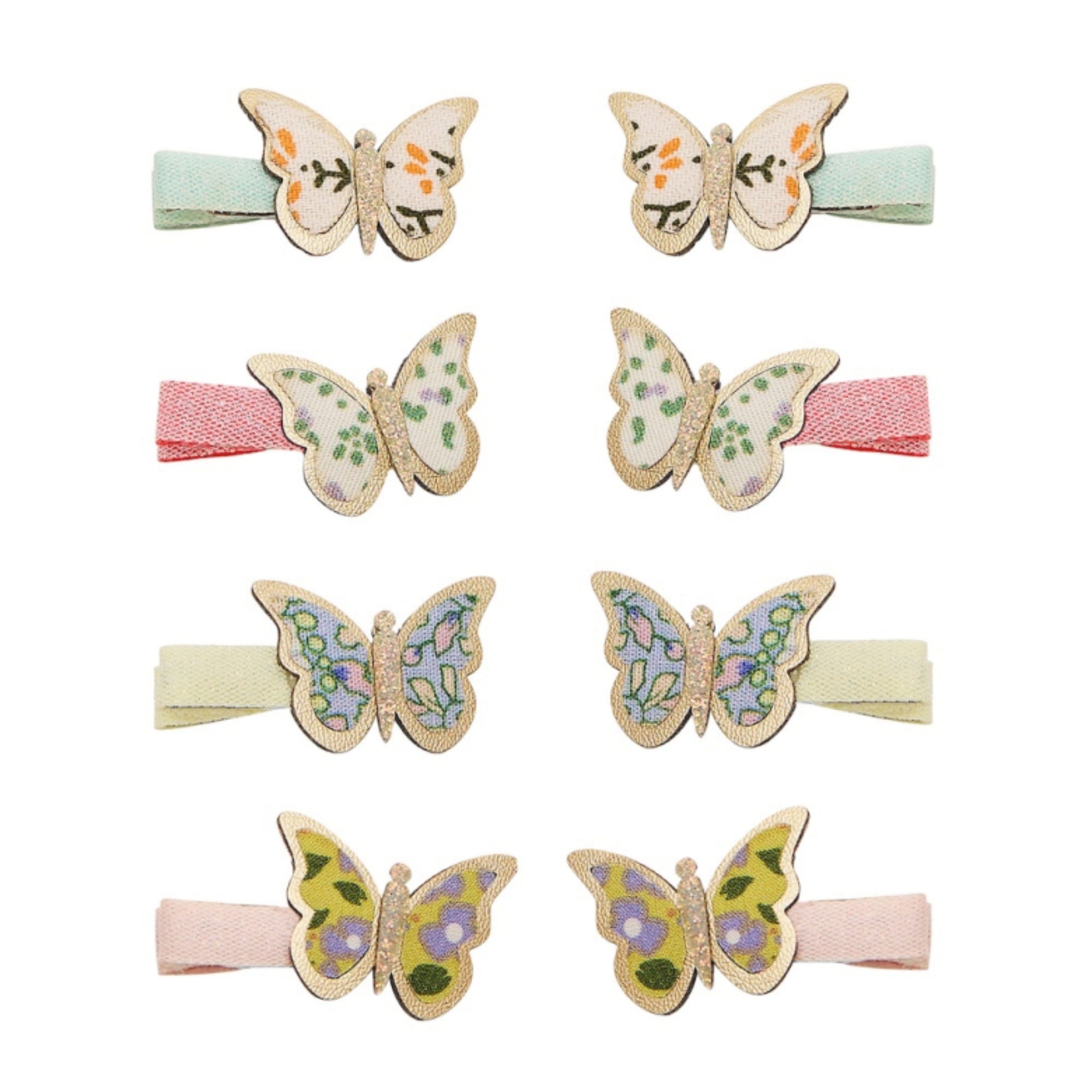 Add a flutter of fun with our Floral butterfly mini clips! Each dainty gold-edged butterfly is perched atop a contrasting colourful clip, perfect for tiny tresses and big adventures!