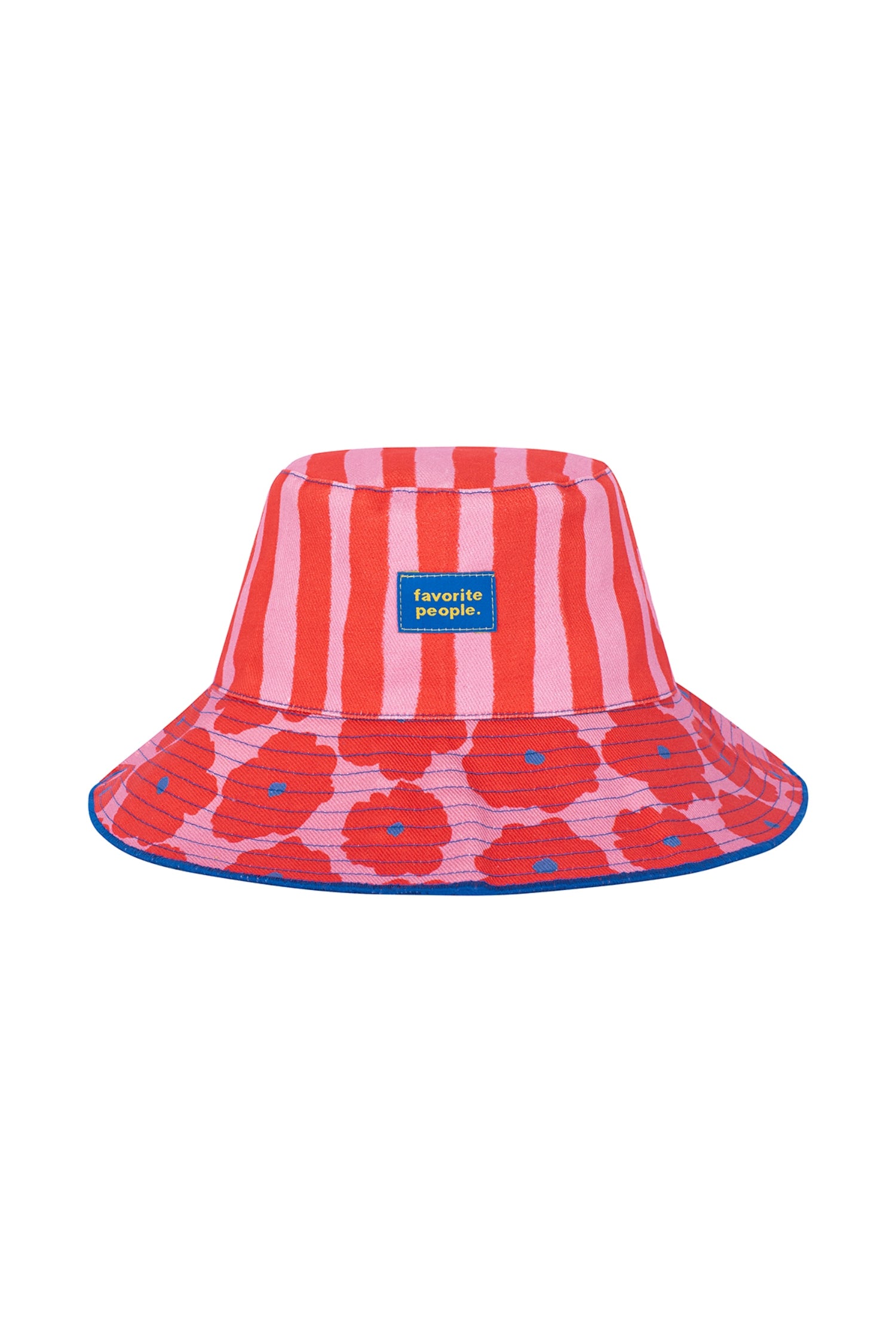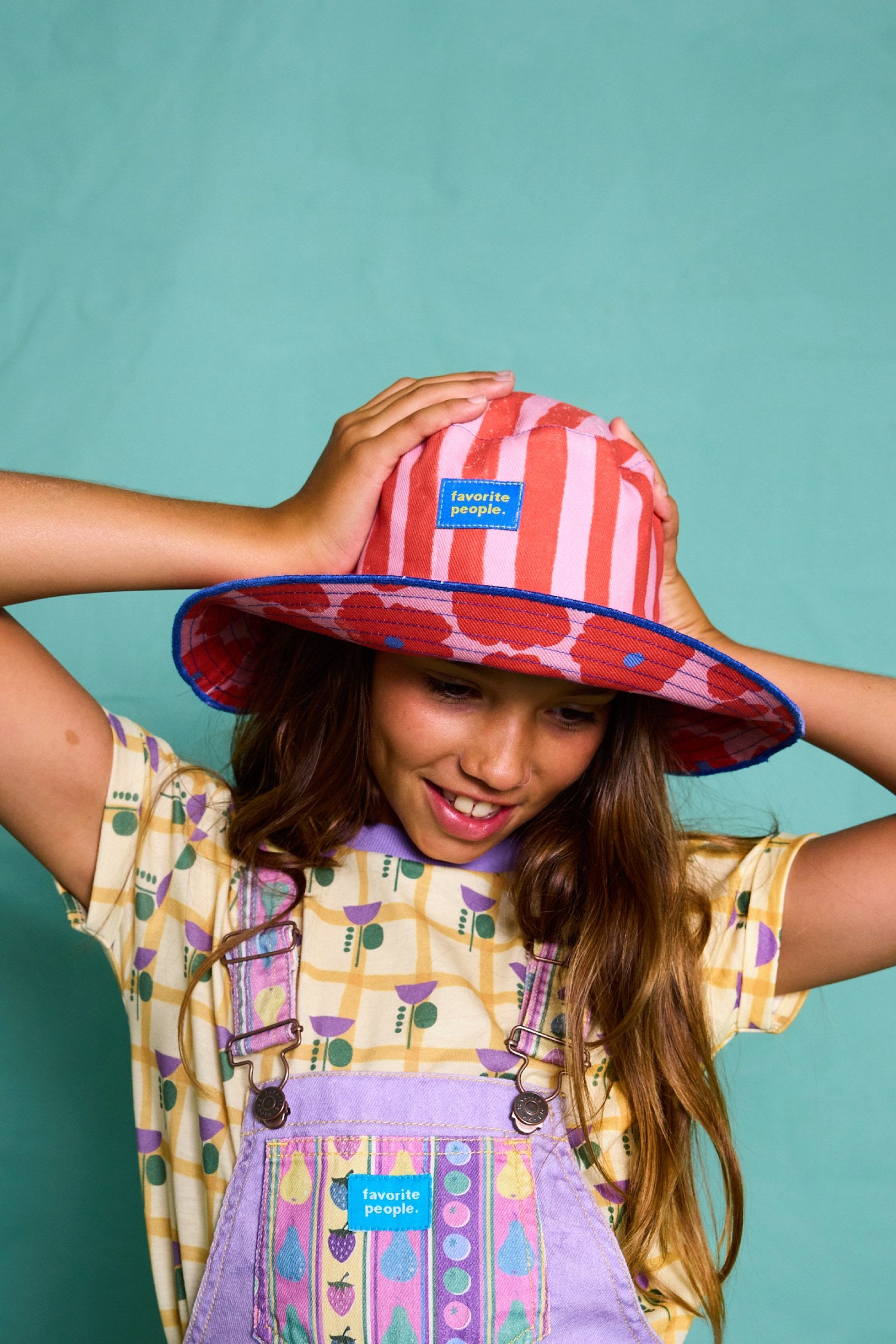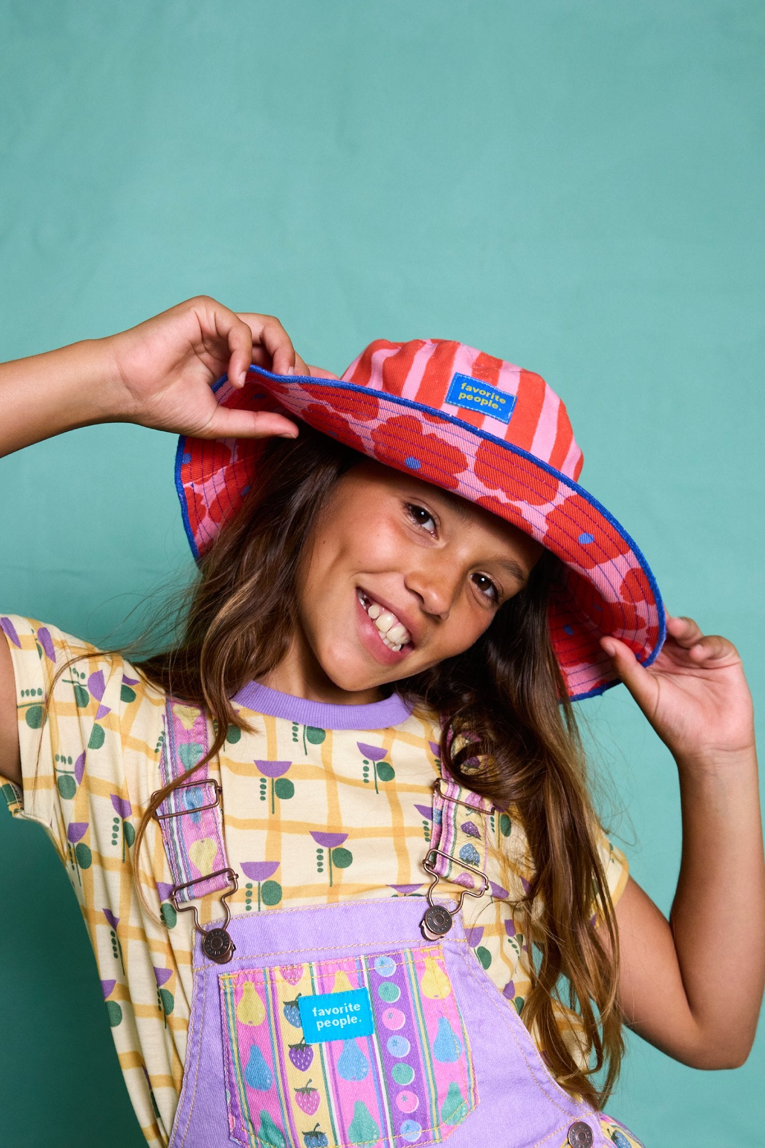 Finish off any outfit and keep them shaded with this eye-catching kids bucket hat in pink with bold red florals. Lightweight and fully lined for comfort, it’s an easy, everyday summer essential. Pair with our kids dungarees for an adorable summer outfit.