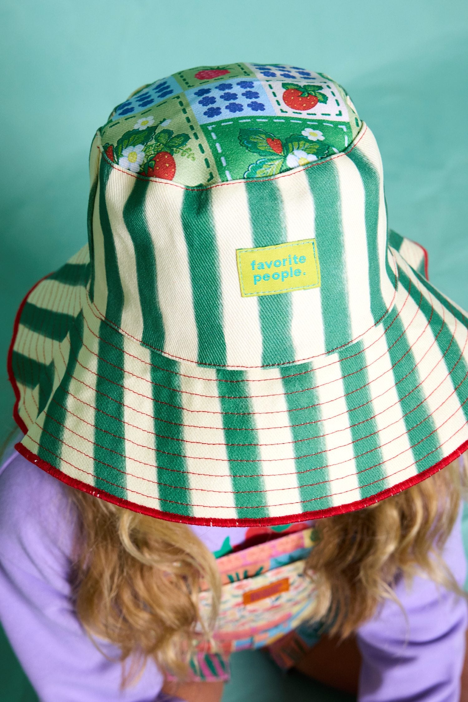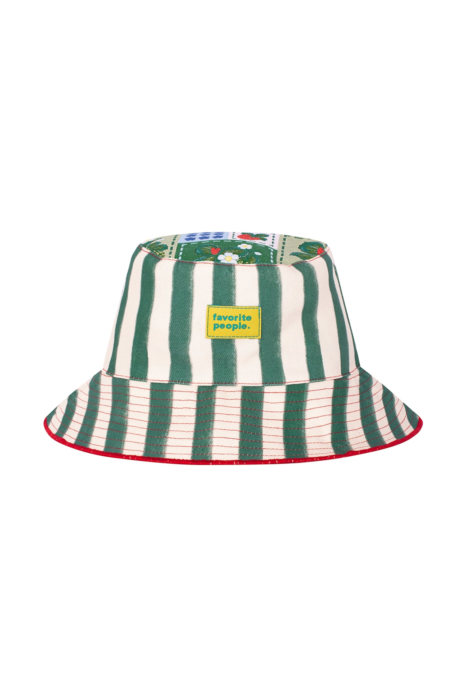 Colour: White + Green - Striped, with playful Fruit + Floral illustrations on top.