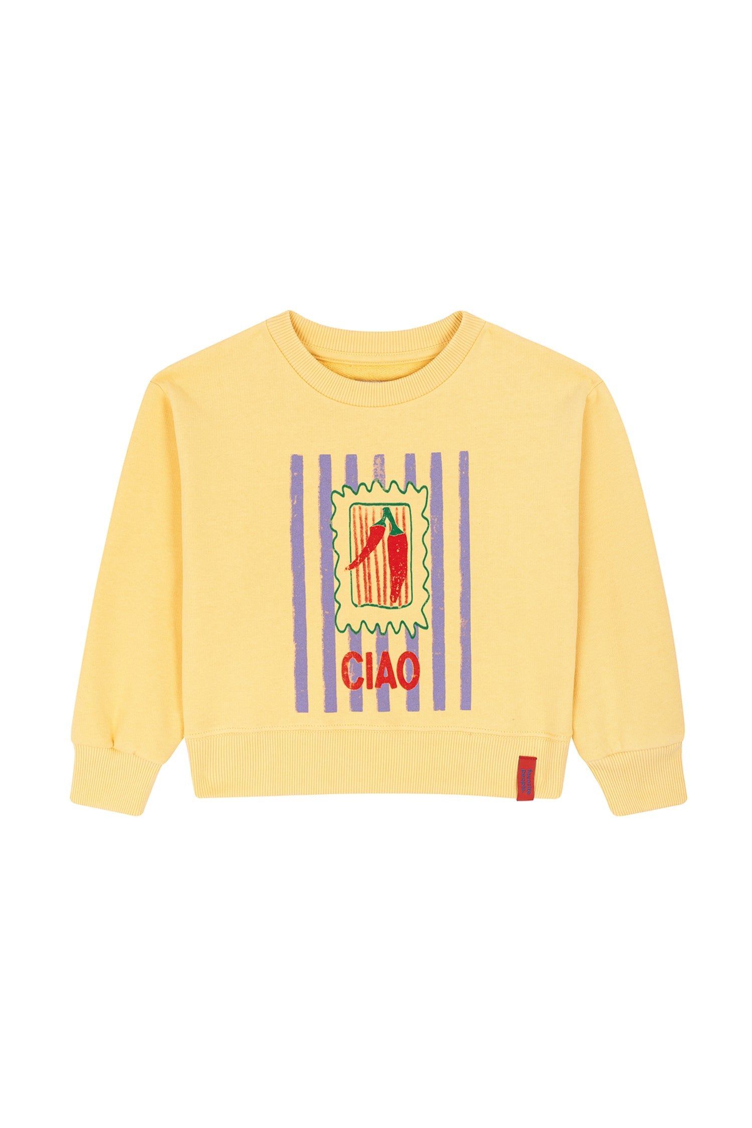 The cosy ‘Ciao’ sweatshirt in soft butter yellow is made for easy summer days and throw-on-and-go outfits. Crafted from ultra-soft cotton with a relaxed fit, it’s finished with ribbed cuffs and playful red lettering, lilac stripes and chilli pepper illustrations for a fun, feel-good touch. Comfortable, cheerful, and designed to be worn on repeat.