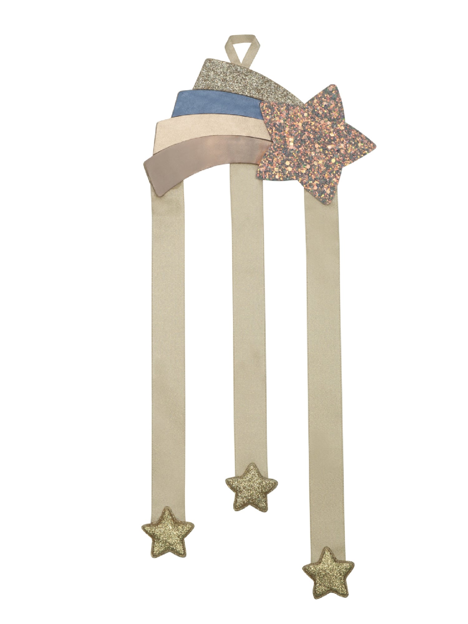 Your clip storage prayers have finally been answered, and in the prettiest way possible! Yay!! Featuring a shooting star in a combination of glitter, metallic and soft suedette fabrics, with pretty satin ribbons featuring gold glitter padded stars.