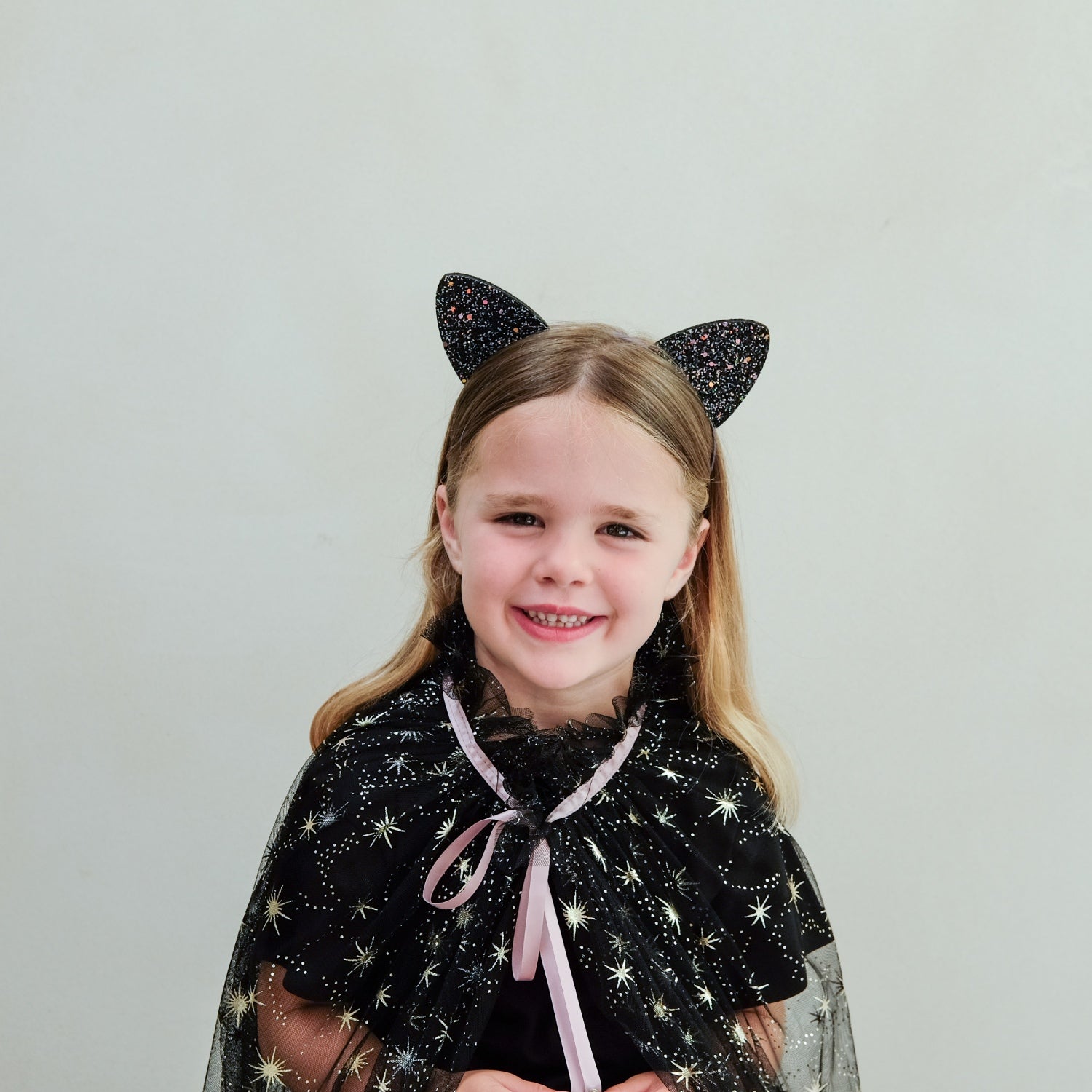 Embrace your inner feline with these gorgeously glittery cat ears! Super lightweight and comfy, these are the ideal finishing touch for any meow-velous moggie this Halloween! The band is satin ribbon wrapped, with cute cat ears crafted from chunky glitter fabric.