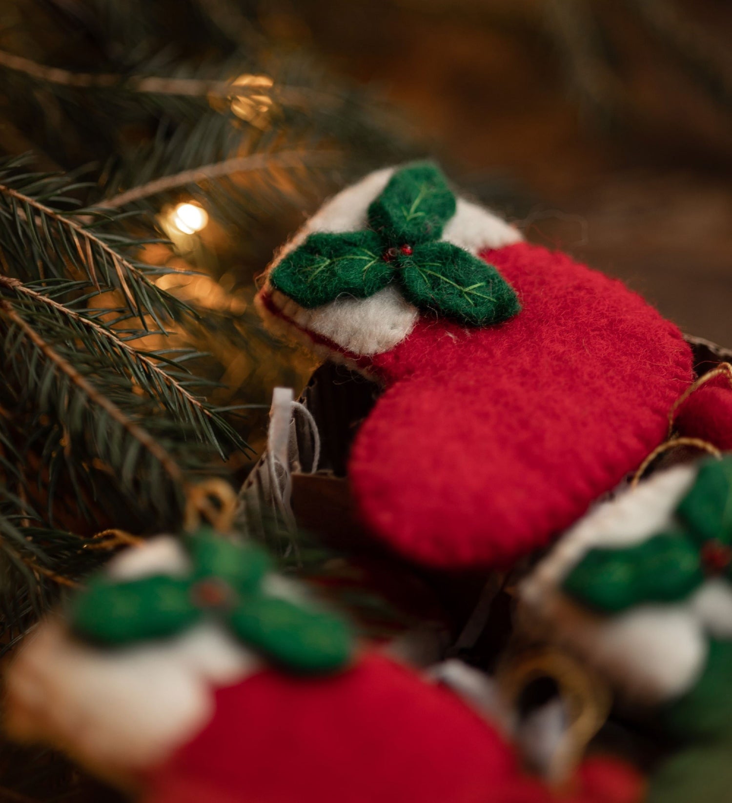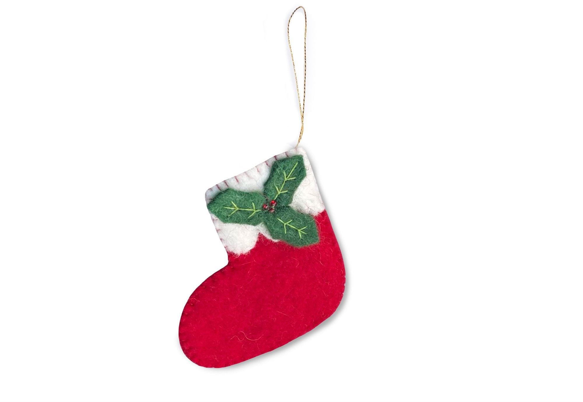 Add a burst of holiday cheer to your home with our classic Christmas Stocking tree decoration. Handmade and crafted from wool with a recycled polyester filling, and adorned with charming holly leaves and tiny red bead berries, each piece is truly unique.