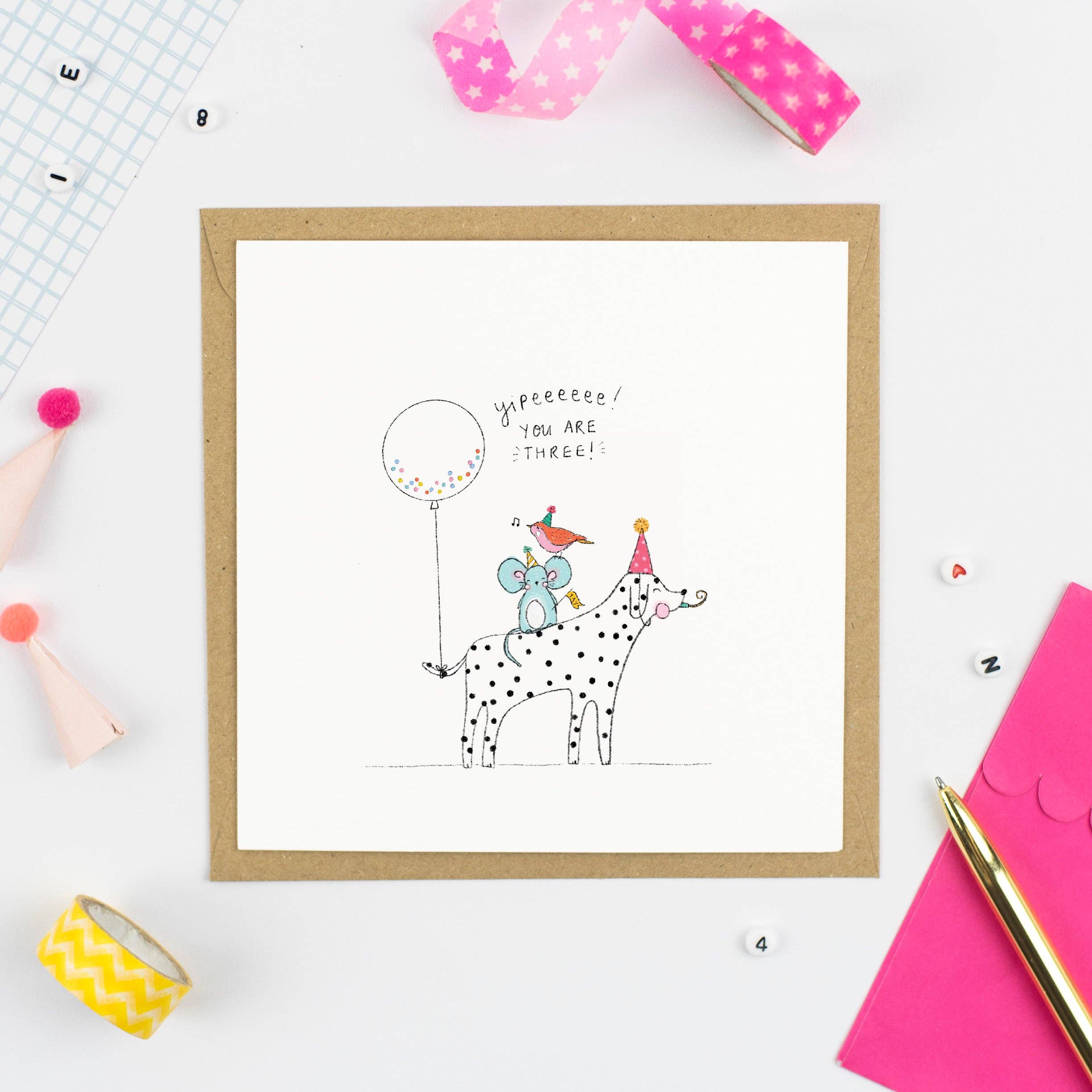 A gorgeous little keepsake card for that milestone third birthday. Original illustration on beautifully textured card. Blank inside for your own birthday wishes.